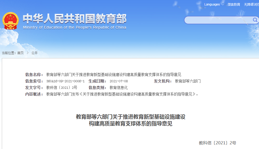 教育部等六部门关于推进教育新型基础设施建设构建高质量教育支撑体系的指导意见