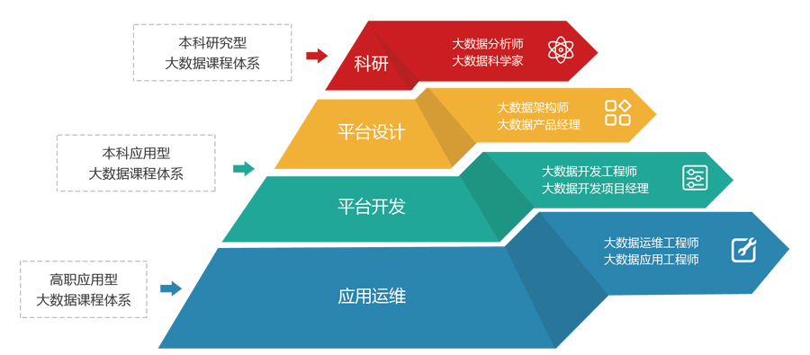 大数据课程体系结合大数据产业环境、岗位模型、企业人才需求,设置了本科应用型、本科研究型、高职三大课程体系,针对每门课程提供教学实验指导手册、在线视频、资源包、实验示例代码等,让学生学以致用;不仅学习大数据技术的基本理论和原理,还可学习大数据平台架构的技术实现及其在行业内的典型应用。