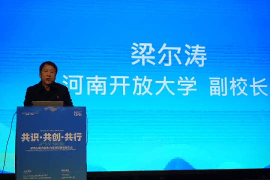 河南开放大学副校长梁尔涛在交流会上致辞,他指出作为全国人工智能通识教育产教融合共同体牵头单位,他回顾了共同体在“五金协同育人体系” 建设上的阶段性成果,明确2026年将持续深化相关建设、推进职业院校人工智能通识教育普及覆盖的目标,并表示学校将继续发挥牵头作用,携手各方深耕产教融合,构建人工智能教育生态。